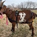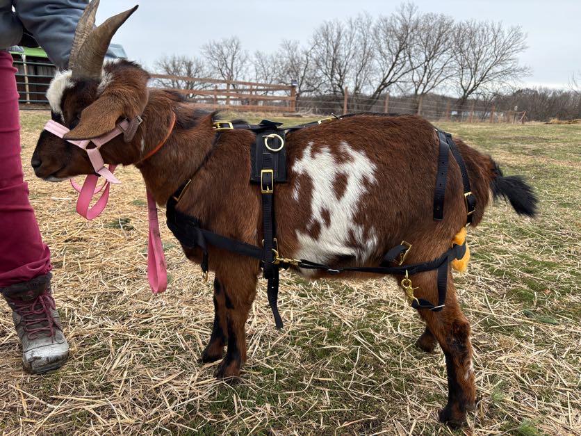 Great nylon webbing driving harness made to fit most dwarf/ pygmy goats. Solid brass hardware.. Fully padded breast,girth,back saddle and breeching.. Complete with matching twelve foot reins and driving halter. Plenty of adjustability to fit most sizes of Nigerian dwarf and larger Pygmy goats, 80 to 110 lbs. approximate.